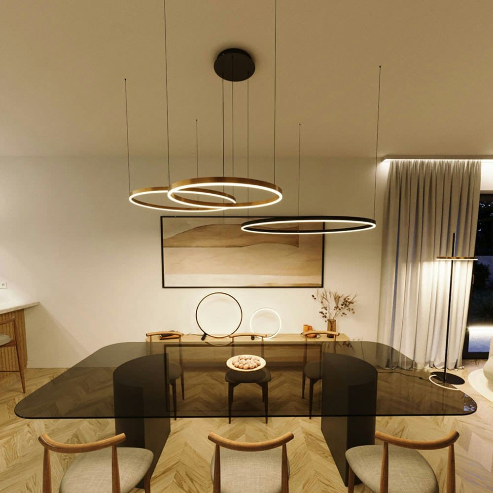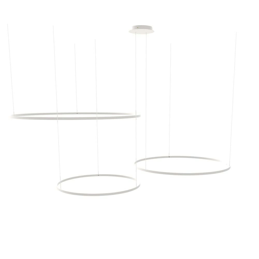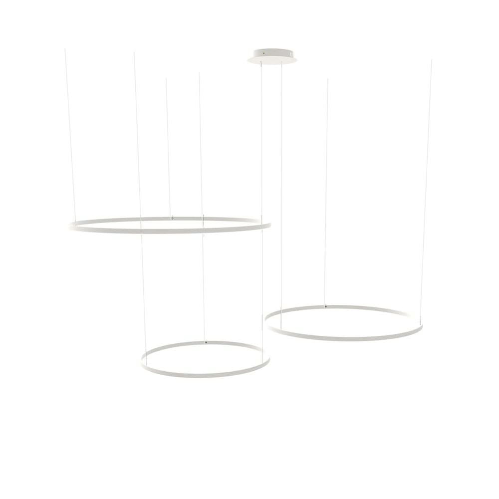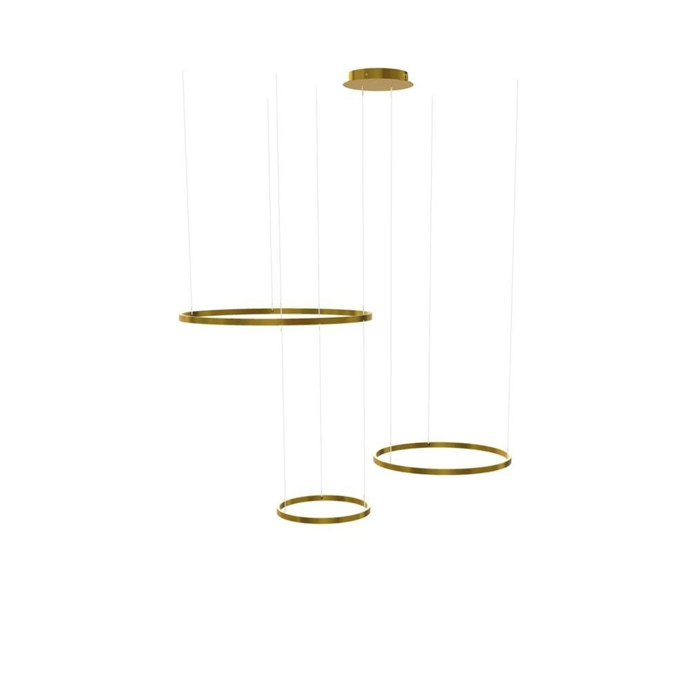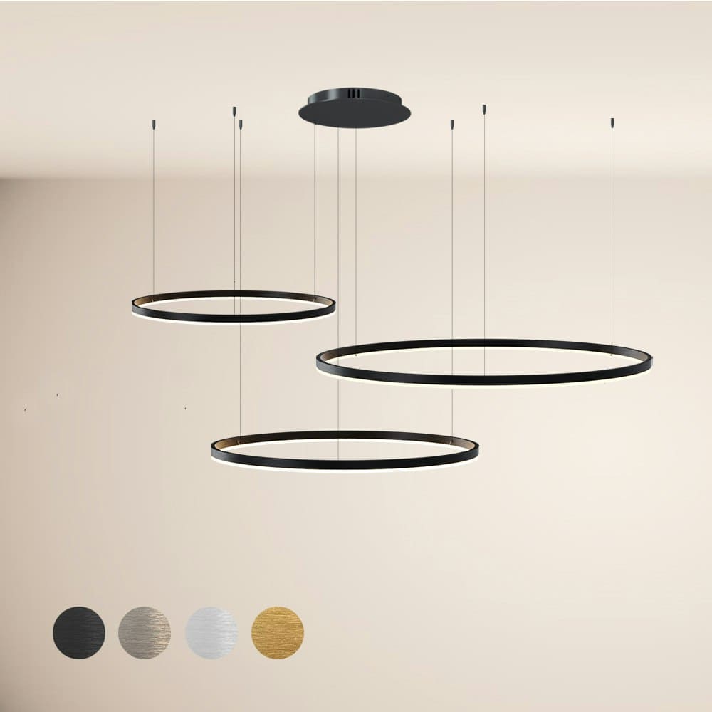 La combinaison de suspensions à 3 cercles excentriques de s.luce représente la symbiose parfaite entre élégance, polyvalence et fonctionnalité. Conçu pour s’intégrer harmonieusement dans n’importe quel environnement, cet ensemble est idéal pour les galeries, les cages d’escalier et les tables. La disposition centrée des anneaux crée un jeu de lumière harmonieux et équilibré, apportant une atmosphère particulière à chaque pièce.