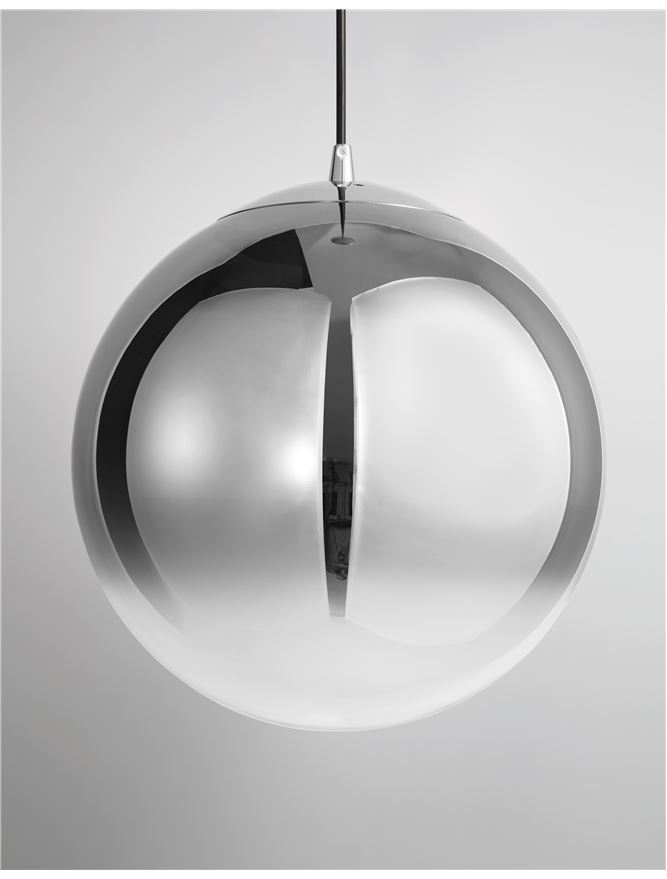 La suspension LAZIONE séduit par son design contemporain et son effet lumineux sophistiqué. Son verre fumé, transparent vers le bas et délicatement chromé vers le haut, filtre la lumière avec élégance et crée une ambiance lumineuse profonde et raffinée.