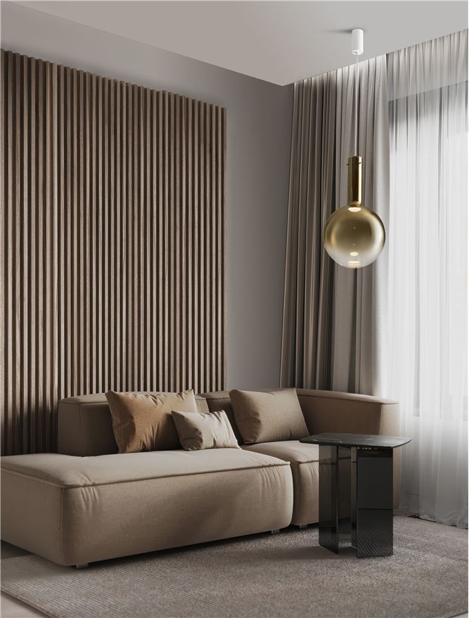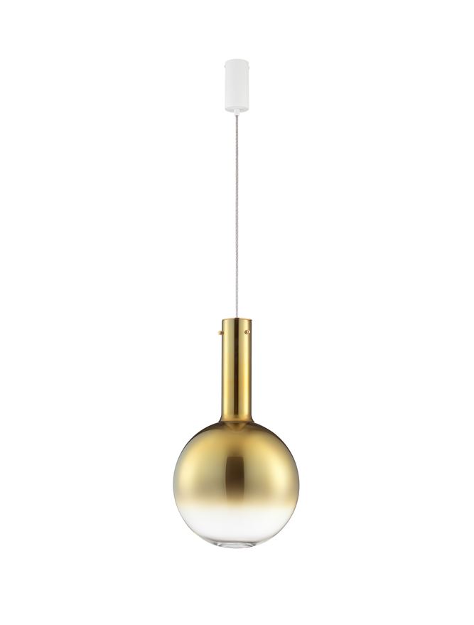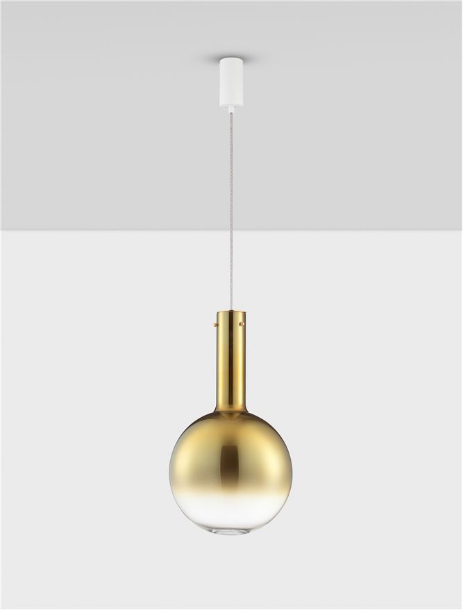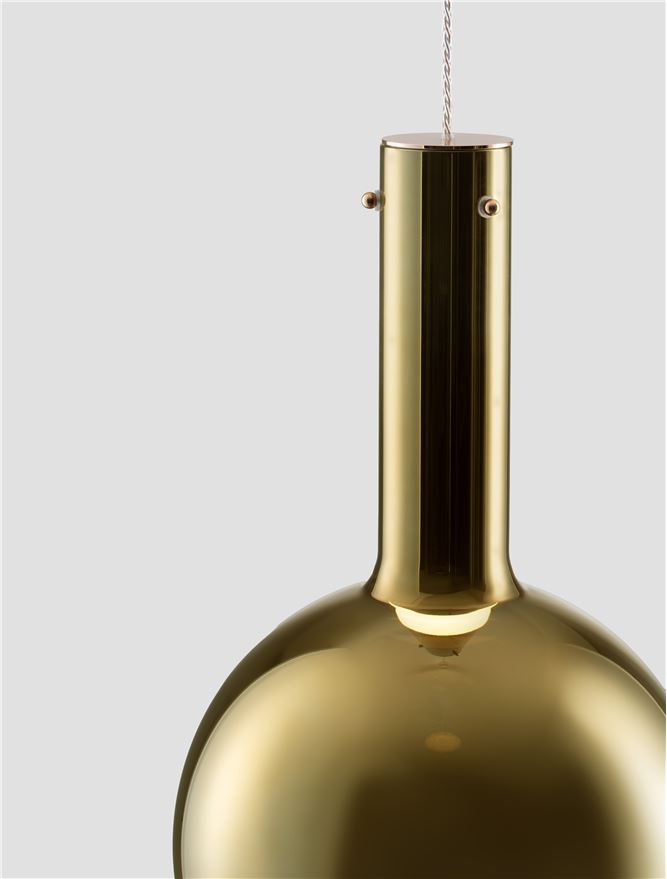 L’abat-jour en verre doré diffuse une lumière chaleureuse et délicatement filtrée, créant une ambiance accueillante et élégante. Cette suspension constitue un point focal idéal au-dessus d’une table à manger, dans un salon ou comme élément décoratif dans un intérieur moderne.