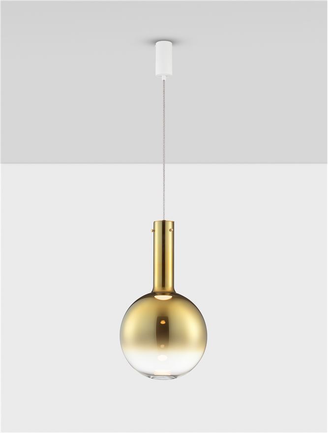 La suspension NOSTOS de Nova Luce séduit par son design contemporain et son effet lumineux raffiné. L’association du verre doré, du métal couleur or et de la base plafond en métal blanc mat confère au luminaire une élégance luxueuse et harmonieuse.
