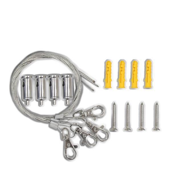Si vous souhaitez suspendre des panneaux rectangulaires plus grands (supérieurs à 100 cm), nous recommandons d’ajouter deux câbles supplémentaires au centre du côté le plus long du panneau pour éviter l’affaissement.